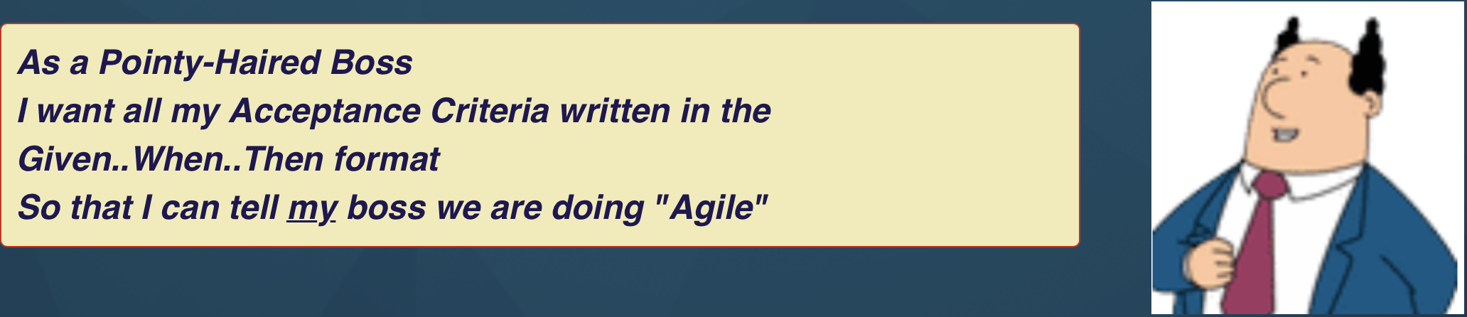 Another key point from this step is that, in BDD, the acceptance criteria are written not by the BA or the product owner, but by the whole team. There's a lot of subtle agile phsycology that goes into this little detail, but take my word for it, it's super important.
