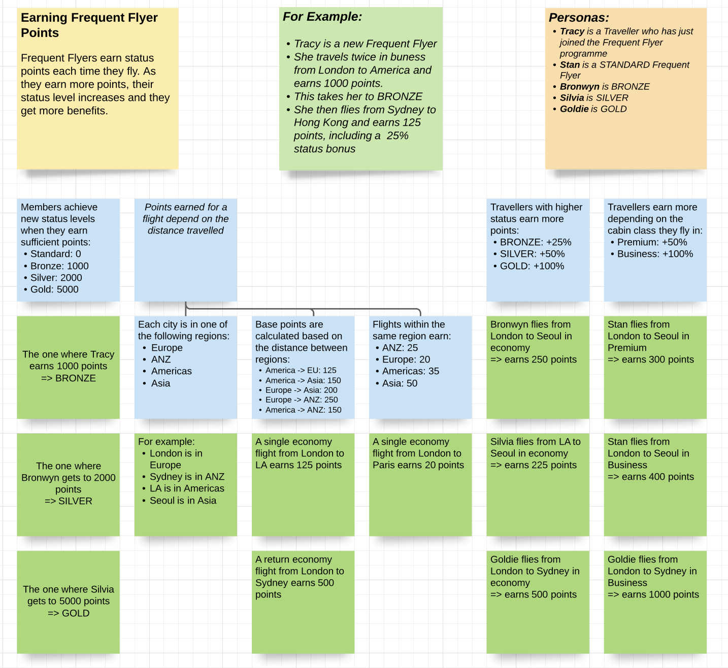 This step sound's easy but it actually takes a fair bit of practice and technique to run these conversations effectively. That's why the BDD community over the years has come up with practices like Example Mapping and Feature Mapping (see diagram) to help guide and structure the conversations, that make sure everyone stays focused and help record the examples and rules in a systematic way.